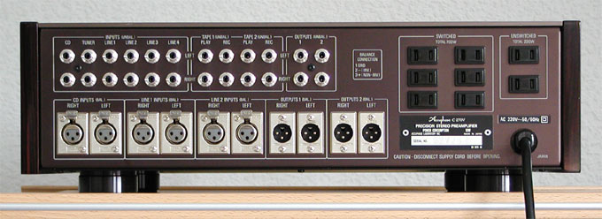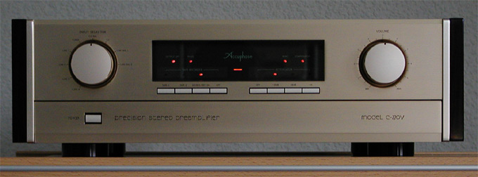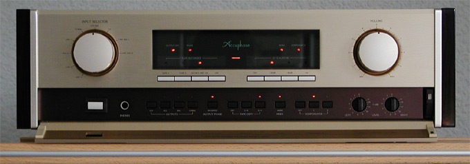Accuphase C-270V Accuphase C-270V, eine wahrhafte High End Vorstufe mit reichlich Ein und Ausgängen. CD, Tuner, Line 1-4 sowie 2 x Tape in / out und zwei Chinch Vorstufen Ausgänge. Außerdem drei Symetrische (XLR) Eingänge und zwei Symetrische Vorstufen Ausgänge. Die Enzelnen Vorstufen Ausgänge sind Frontseitieg ab u. zuschaltbar. zweitstufige Mutingschaltung, Phasen Korrekturschaltung, Mono Schaltbar, Balance Regler. Maße: 475 x 149 x 375 mm BxHxT. Gewicht: 22 KG. Incl. OVP 27 KG. Die ehemaligen Neupreis lagen zwischen 13.200,- und 15.000,- DM. Für gut erhaltene Geräte muß man, sofern überhaupt verfügbar zwischen 2.200,- und 2.600,- Euro rechnen.