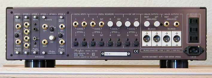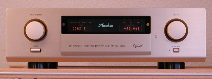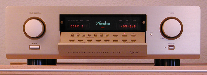 Accuphase DC-300, Die Accuphase DC-300 ist meine derzeitige Lieblings Vorstufe, klanglich ähnlich er C-290, aber mit der möglichkeit Digital Quellen anzuschließen, geliefert wird sie mit nur einem Analogen Eingang, zu sehen ganz links alle andere Analog und Digital Eingänge wurde optional nachgerüstet. Das schöne an Ihr ist die Fernbedienbarkeit, mit welcher Accuphase sich ja lange zurück hielt, hier jedenfalls ist es möglich die Lautstärke, Balance, Toneinstellungen, Mute sowie die Quellenwahl per Fernbedienung vorzunehmen. Der Neuprei lag beim Grundmodell bei ca. 28.000,- DM Gebrauchtgeräte liegen bei ca. 3.700,- bis 5.000,- Euro.