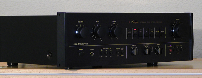 Ausstattung: Neben 5 Hochpegeleingängen gibt es 2 Tape Schleifen sowie Phono MM & MC. Ein Muting Schaltung, MC Anpassbar 10 / 30 / 100 Ohm, Balance Steller, 2 Schaltbare Lautsprecher Paare, Subsonic Filter, Mono/Stereo Schaltung. Tape Copy Schleifen in beiden Richtungen, Kopfhörer Ausgang. BASS & TREBLE Einsteller mit Einsatzfrequenzen 200/500Hz & 7/2 KHz.