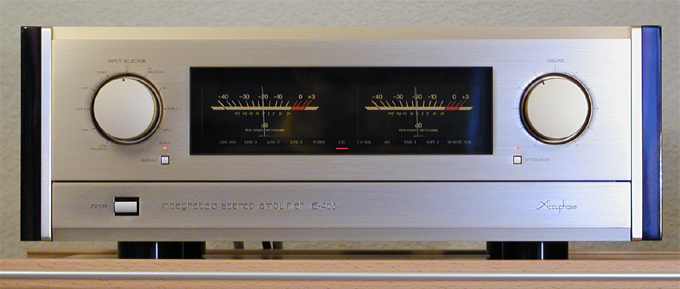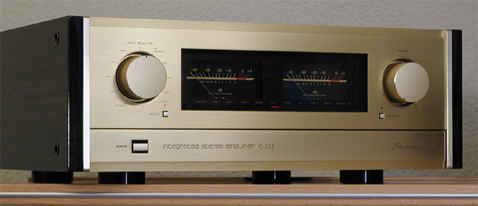 Accuphase E-405 Der Accuphase E-405 ist ein Vollverstärker mit sehr guten Klangqualitäten und Fernbedienung. Bei dem E-405 die Vor.-Endstufe getrennt werden, womit sich die Einsatzmöglichkeiten deutlich erhöhen. Der E-405 kann sowohl als Vorstufe sowie als Endstufe genutzt werden. Er bietet Vorstufenausgänge per Chinch sowie Endstufeneingänge per Chinch und XLR. Als kleinen Bonus kann man auch den bereits eingebauten Phonozweig mit MM und MC Möglichkeit betrachten. Diese Vorzüge muß man sich heute teuer erkaufen. Klanglich rangiert der E-405 deutlich hörbar über dem E-305 sowie aller Vollvstärker der 200.ter Serie. Er zeichnet sich durch mehr Räumlichkeit, Tiefenstaffelung und Druck aus. Zu dem kam eine Fernbedienung erst beim E-305V und den späteren Geräten der 200.ter Serie zum einsatz. Der E-405 ist ein wahrer Allroundkünstler. Der E-305 z.B. ist dem E-405 wie aus dem Gesicht geschnitten, lediglich die optische Information der gewählten Signalquelle direkt unter den VU-Instrumenten ist beim E-305 nicht vorhanden. Man könnte ihn also auch den kleinen Bruder des E-405 nennen. Die V-Version des E-305, hatte dann auch eine Fernbedienung. Aber es gibt auch schwachstellen beim E-405, so müßen je nach Einsatzdauer ca. alle 10 Jahre die Ausgangsrelais entweder gereinigt oder getauscht werden. Der Fehler zeigt sich beim leisen hören, dann nämlich fällt ein oder evtl. fallen auch beide Kanäle aus und/oder der Klang ist verzerrt. Wenn man das Gerät dann in Stand setzen läßt sollte man es gleich komplett durchsehen lassen. Offset prüfen, kalte Lötstellen beseitigen und vom Staub befreien ist unerläßlich. Hierzu sollten Sie möglichst den Deutschen Vertrieb PIA in Weiterstad nutzen. Basteleien sowie Kontaktsprühaktionen sollte man tunlichst vermeiden.