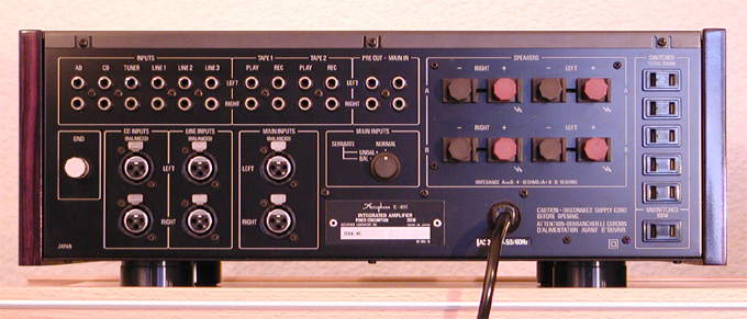 Rückseite: Ein Plattenspieler Eingang MM oder MC. Fünf Hochpegeleingänge. Zwei mal Tape IN/OUT Zwei XLR Eingänge. Ein XLR Endstufen Eingang. ( Beim E-305 nicht vorhanden. ) Ein Chinch Vorstufen Ausgang, ein Chinch Endstufen Eingang. Drehsteller für Wahl der Vor.- Endstufen Auftrenn Operation. Lautsprecher Ausgangsterminal für zwei Lautsprecherpaare. Anschlüsse für weitere Netzgeräte. ( Alle Ausstattungsmerkmale beim E-305 identisch )