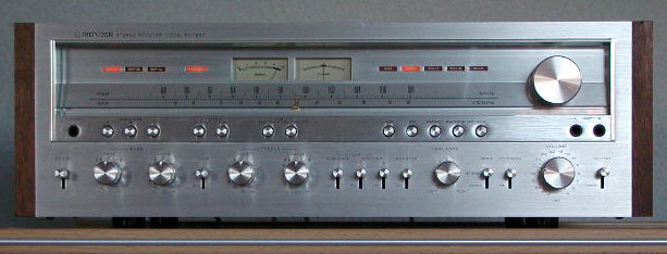 Pioneer SX-1250, grösster Reseiver seiner Zeit, mit ca. 30 KG stellt er das auch eindrucksvoll zur Schau. Seine Maße sind 55,6 x 18,6 x 46,4 cm. Wie man gut sehen kann verfügt er über einen Trafo sowie Ladeelkos von denen auch viel heutige Endstufen nur Träumen können. Seine Leistung liegt bei 2 x 200 Watt an 4 Ohm. Der Frequenzgang betrug nach damaligen Massstäben gigantische 5 - 100.000 Hz. Dazu kam die Rundum Sorglos Ausstattung, wie z.b. Auftrennbare Vor.- Endstufe sowie diverse Eingänge wie Tuner, Aux, 2 x Phono, 2 x Tape in/out, Adaptor zum einschleifen eines Equilizer. Diverse Filter, Klangregelung Höhen, Mitten, Tiefen. Mutingschaltung für Audio und Tuning. Erstaunlicher Weise sind noch keine Kratzgeräusche beim betätigen der Regler und Schalter aufgetreten und das obwohl das Gerät sicher schon 25 Jahre auf dem Buckel hat, hatte auch schon andere Geräte die bereits im Prospekt Kontaktschwierigkeiten hatten. Der ungefähre Neupreis lag ca. 1976 bei 3.400,- DM. Sollte es jemanden geben der evtl. auch so ein Gerät hat, möge er doch bitte seine Erfahrung mit diesem Gerät an mich weiter geben. Ausserdem suche ich noch eine Bedienungsanleitung zu diesem Gerät.